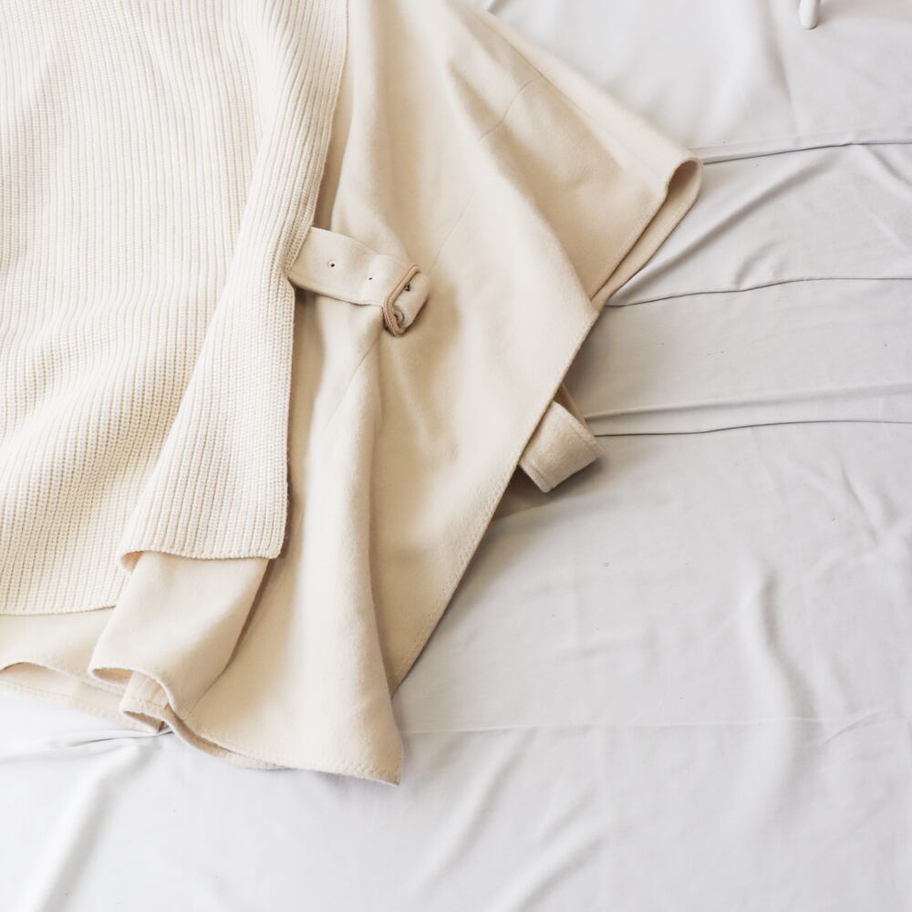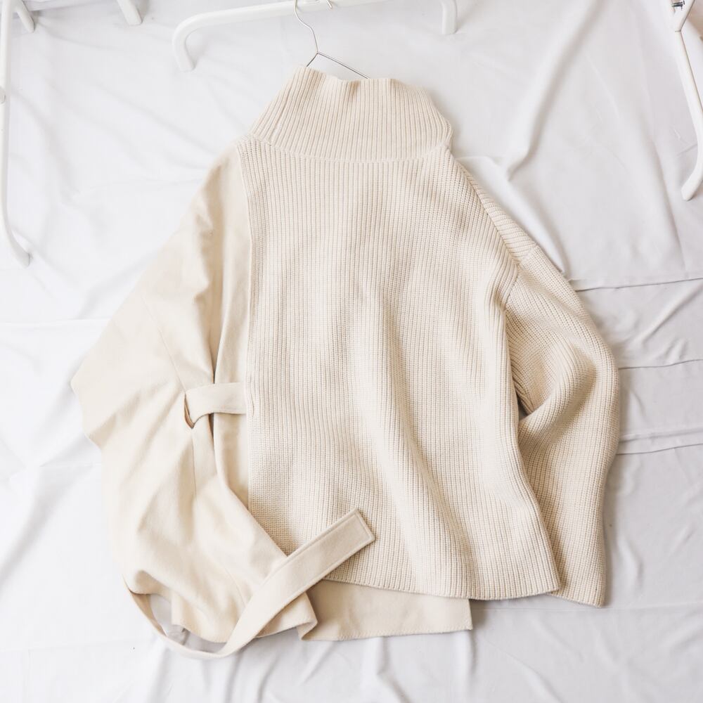 一見シンプルなハイネックニットですが、片側が「ポンチョ」のように優雅に広がるアシンメトリーデザインが特徴的な一着です。肉厚で上質なウール100%の素材感が、画面越しでも伝わるほどの高級感を放っています。