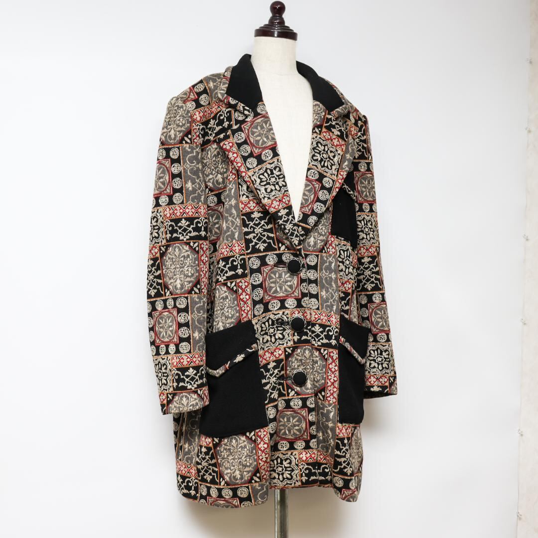 良品 レトロ チェスターコート 総柄 レディース F 古着 ヴィンテージ 長袖 ジャケット アウター 幾何学柄 肩パットあり vintage used ユーズド 小松菜奈 B021