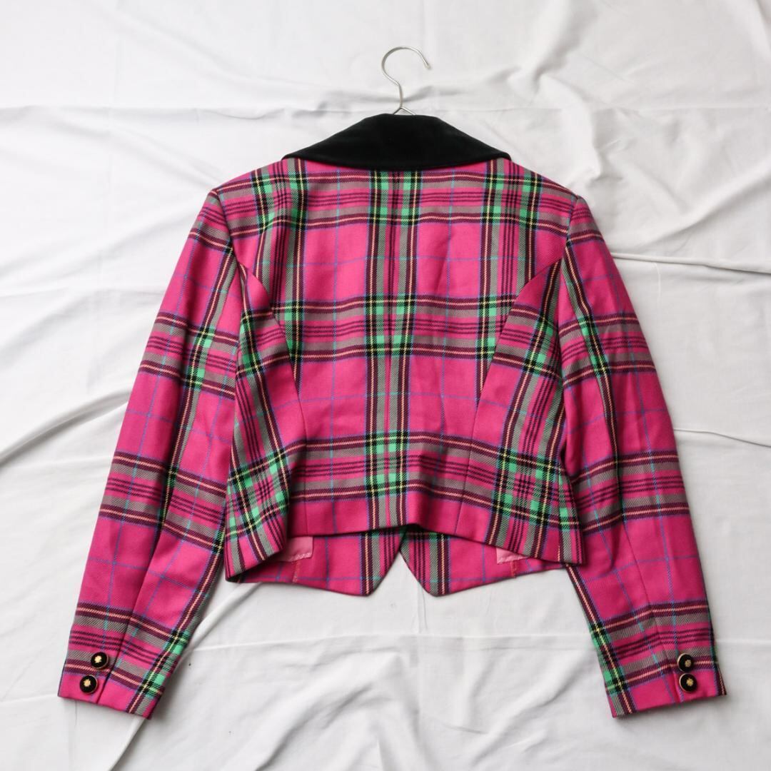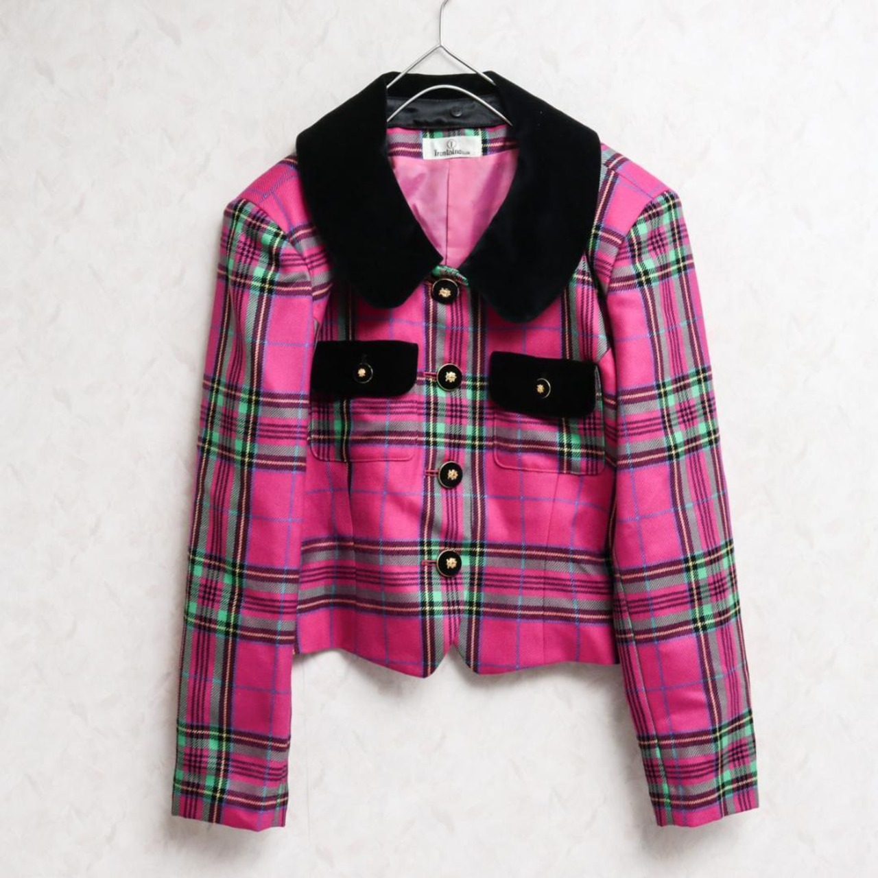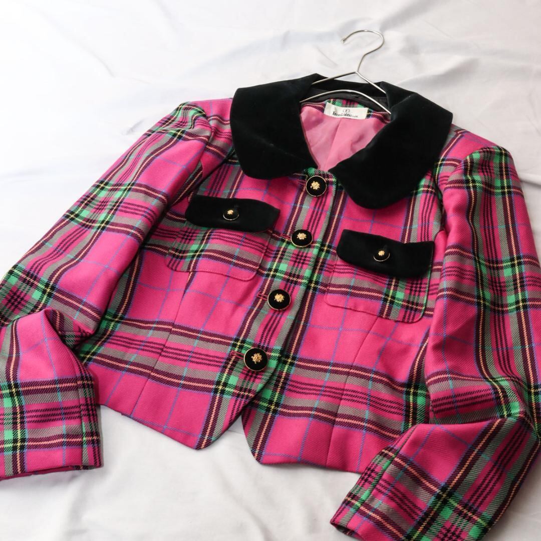 レトロ ジャケット ベロア レディース 古着 ヴィンテージ 長袖 ベルベット 短丈 チェック 総柄 襟は取れます(画像参照) ノーカラー 肩パットあり vintage used ユーズド TRENTAINE 二階堂ふみ B199